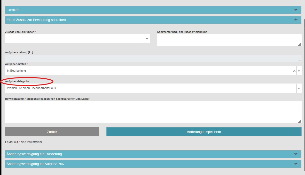Dieses Modul ermöglicht der Sachbearbeiter-Rolle, eine Aufgabe – optional mit einem Kommentar – an einen weiteren Bearbeiter zu delegieren. Gründe hierfür können u. a. sein: