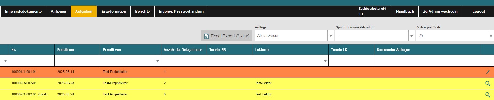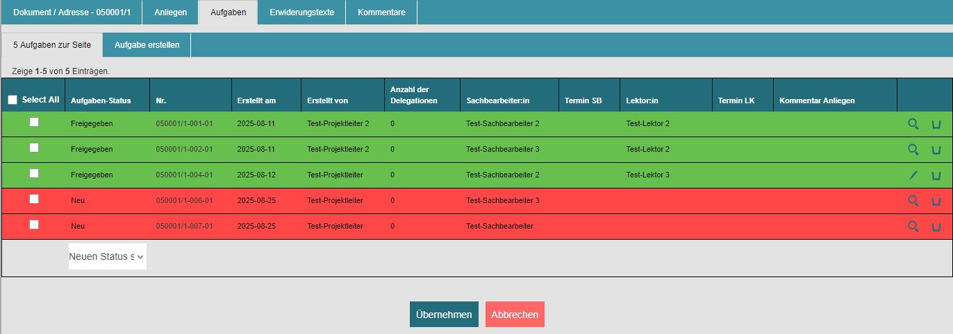Dies ist in der Übersicht der Aufgaben in der Dokumentebene möglich (vgl. Abb. 7) oder über den Reiter (vgl. Abb. 8).
