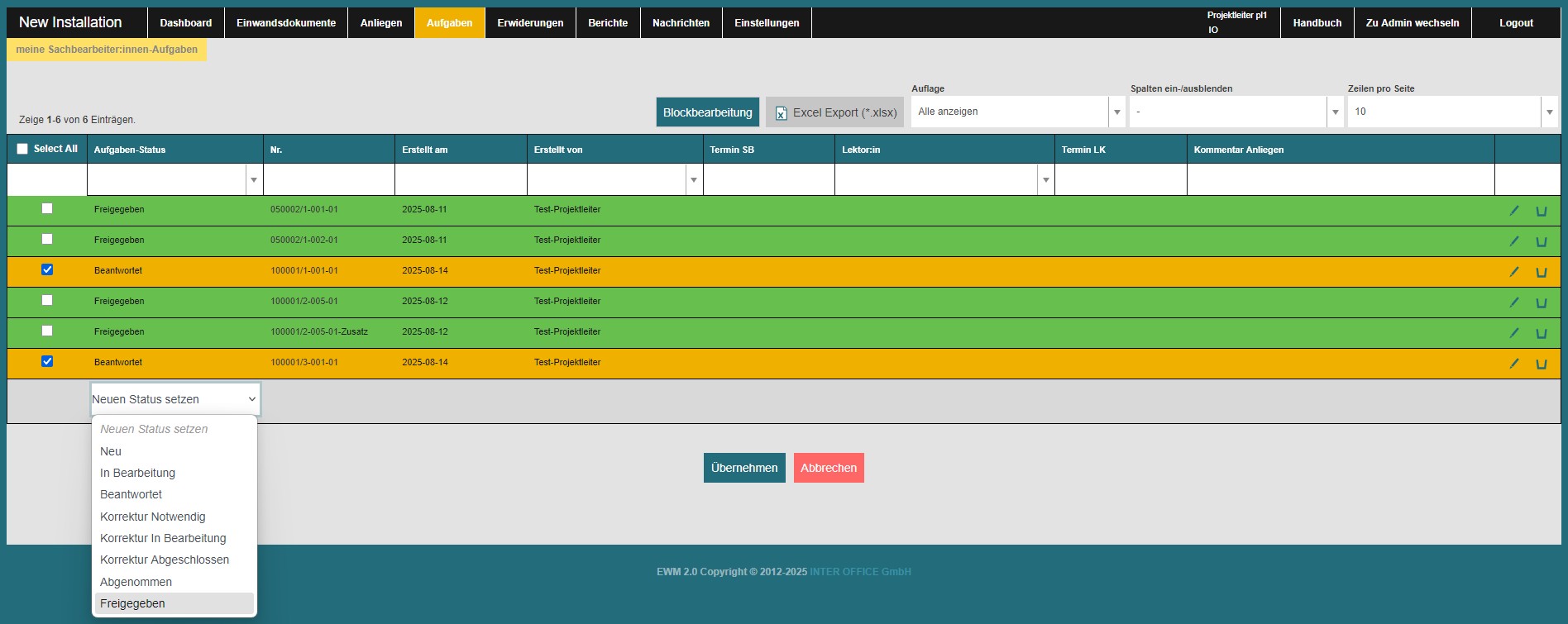 Diese Funktionalität steht der Benutzerrolle Projektleiter zur Verfügung. Sie ermöglicht es, den Status der Aufgaben in einem Schritt zu bearbeiten und damit den Status mehrerer Aufgaben gleichzeitig zu ändern. Dazu können die gewünschten Aufgaben markiert und im Block angepasst werden.