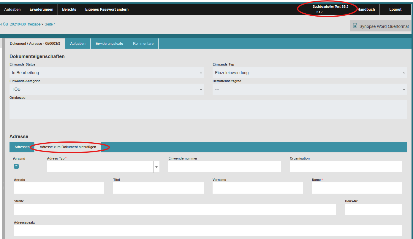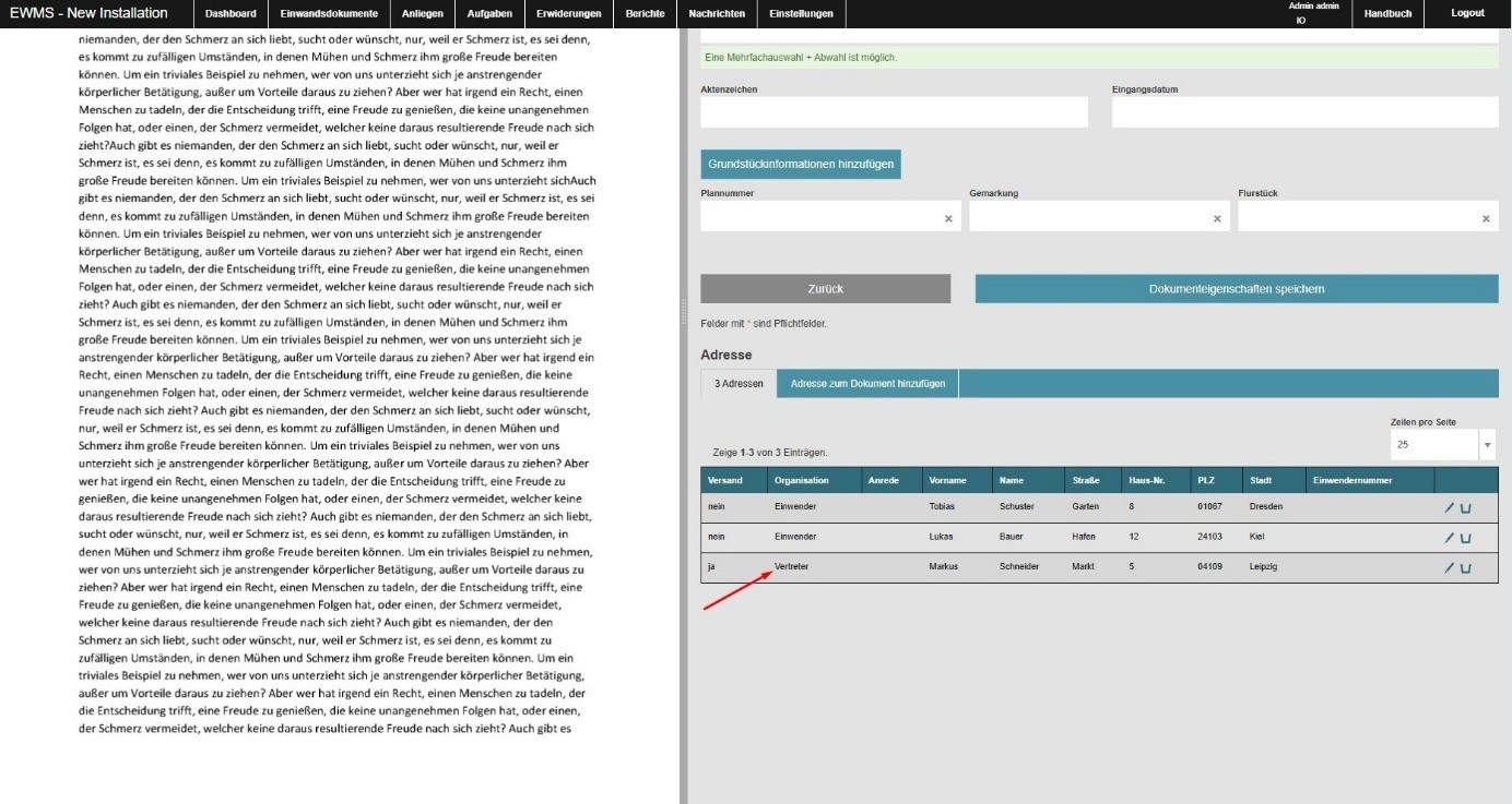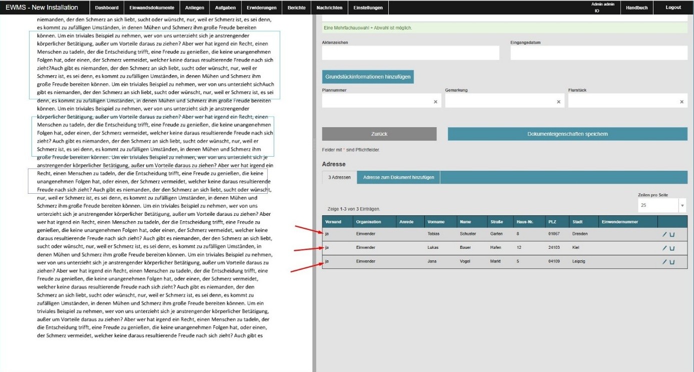 Sind mehrere Adressen vom Typ „Einwender“ zu einem Einwandsdokument vorhanden,