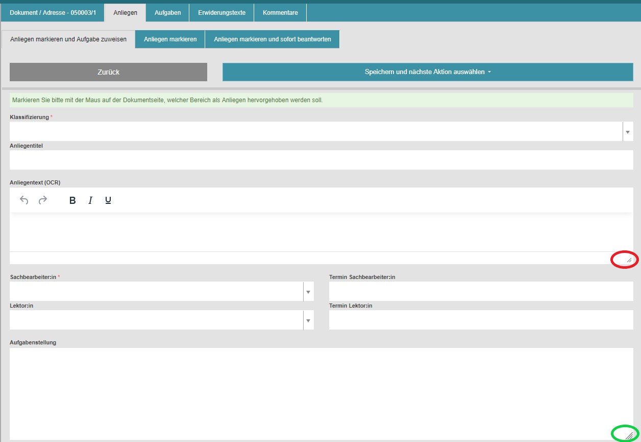 Hinweis: Die Funktion wurde nur für das Textfeld Anliegentext (OCR) angepasst.