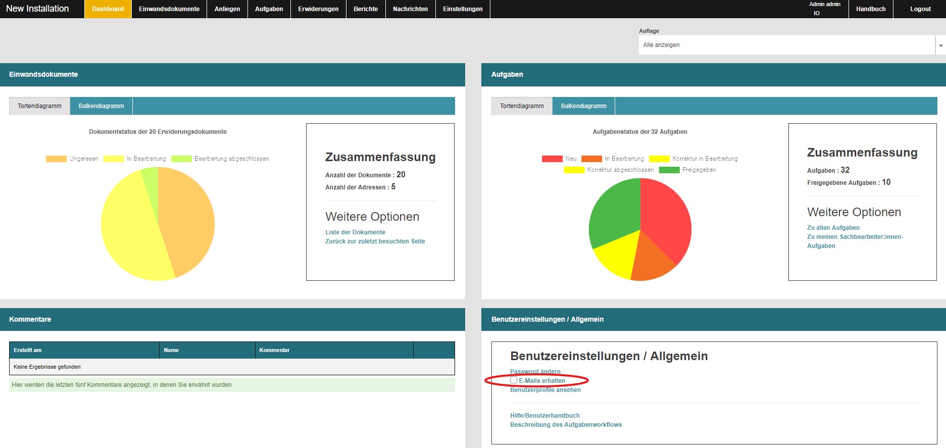 Ist dieses Modul aktiviert, können Sie auf Ihrem Dashboard unter Benutzereinstellungen (Abb. 6) wählen, ob Sie eine E-Mail Benachrichtigung zu Ihren neuen Aufgaben erhalten möchten. Das System prüft einmal täglich, ob Sie seit Ihrem letzten Login neue Aufgaben erhalten haben und sendet Ihnen in diesem Fall eine kurze Erinnerung.
